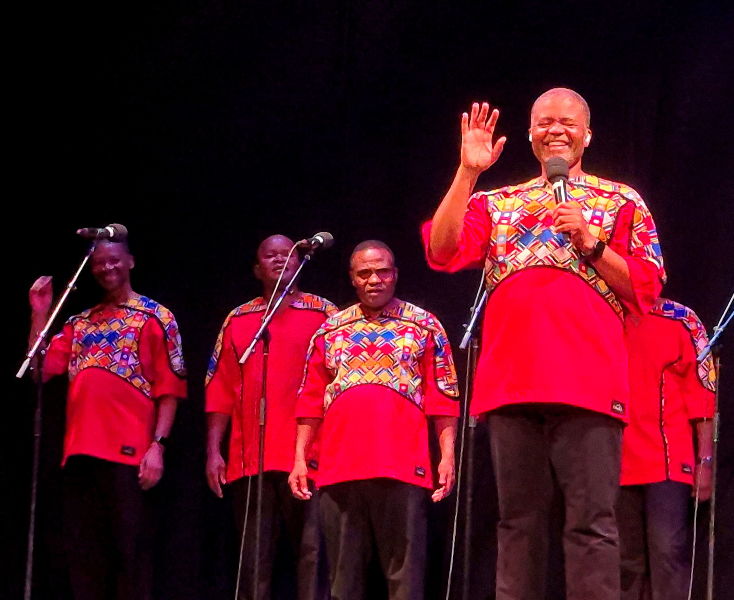 At The Royal – on a virtually unadorned stage and behind a simple row of microphones – the nine members of the current choir quickly captivated the sell-out crowd with their infectious call-and-response routines, their silky harmonisation and their soulful melodies – the which were energetically underscored by their exuberant choreography. Our faces were wreathed with delighted smiles throughout.